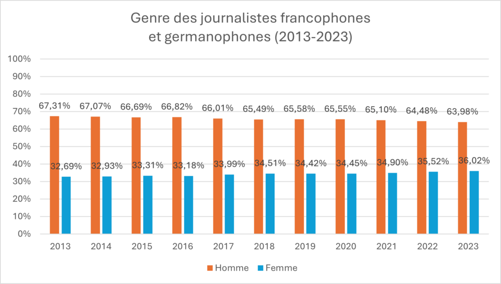 En 2013, sur toute la profession – c’est-à-dire sur les 4991 journalistes professionnel∙les, stagiaires, francophones, germanophones et néerlandophones – les femmes journalistes étaient 1604 et représentaient ainsi moins de 33% de la profession. Une décennie plus tard, moins de 200 femmes journalistes sont venues combler leurs rangs : en 2023, elles sont 1799 sur toute la profession (5154)[1], soit un peu moins de 35% de la profession.